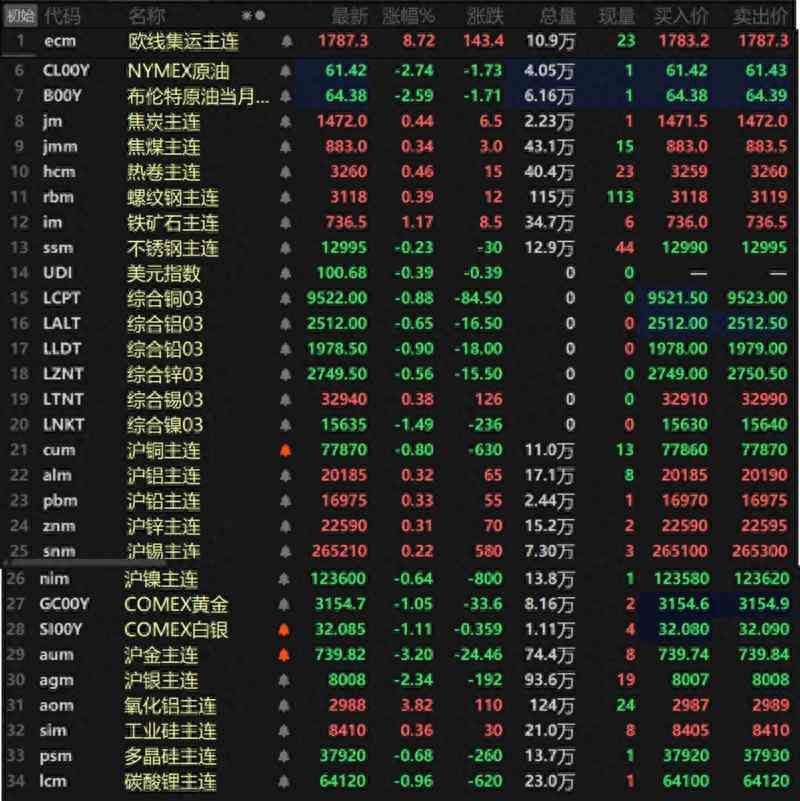 此外,碳酸锂主连跌0.96%,多晶硅主连跌0.68%,工业硅主连涨0.36%。欧线集运主连大涨8.72%。