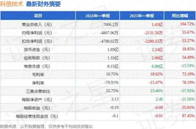 据证券之星公开数据整理,近期科信技术(300565)发布2025年一季报。截至本报告期末,公司营业总收入1.43亿元,同比上升104.72%,归母净利润-2131.58万元,同比上升55.67%。按单季度数据看,第一季度营业总收入1.43亿元,同比上升104.72%,第一季度归母净利润-2131.58万元,同比上升55.67%。本报告期科信技术盈利能力上升,毛利率同比增幅73.19%,净利率同比增幅78.19%。