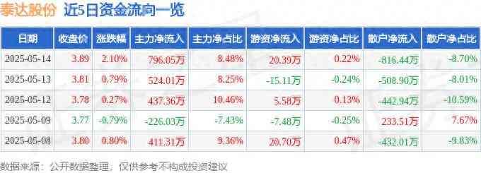 5月14日的资金流向数据方面,主力资金净流入796.05万元,占总成交额8.48%,游资资金净流入20.39万元,占总成交额0.22%,散户资金净流出816.44万元,占总成交额8.7%。
