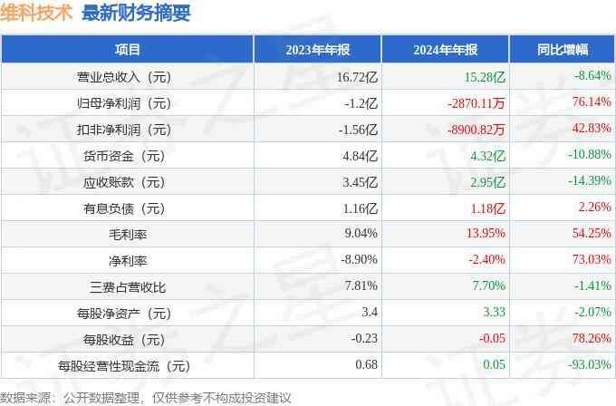 据证券之星公开数据整理,近期维科技术(600152)发布2024年年报。截至本报告期末,公司营业总收入15.28亿元,同比下降8.64%,归母净利润-2870.11万元,同比上升76.14%。按单季度数据看,第四季度营业总收入4.27亿元,同比下降13.9%,第四季度归母净利润-2922.85万元,同比上升30.96%。本报告期维科技术盈利能力上升,毛利率同比增幅54.25%,净利率同比增幅73.03%。