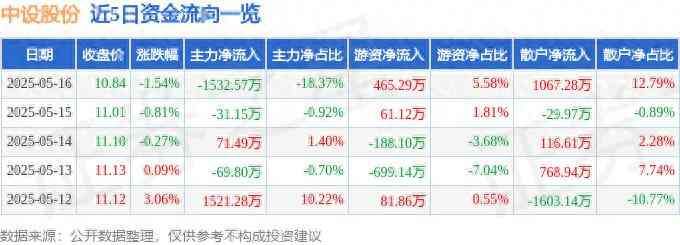 中设股份(002883)5月16日主力资金净卖出1532.57万元