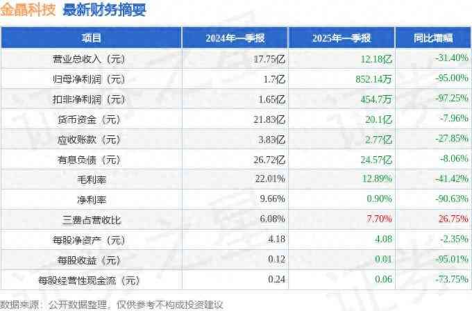 据证券之星公开数据整理,近期金晶科技(600586)发布2025年一季报。截至本报告期末,公司营业总收入12.18亿元,同比下降31.4%,归母净利润852.14万元,同比下降95.0%。按单季度数据看,第一季度营业总收入12.18亿元,同比下降31.4%,第一季度归母净利润852.14万元,同比下降95.0%。本报告期金晶科技公司应收账款体量较大,当期应收账款占最新年报归母净利润比达457.46%。