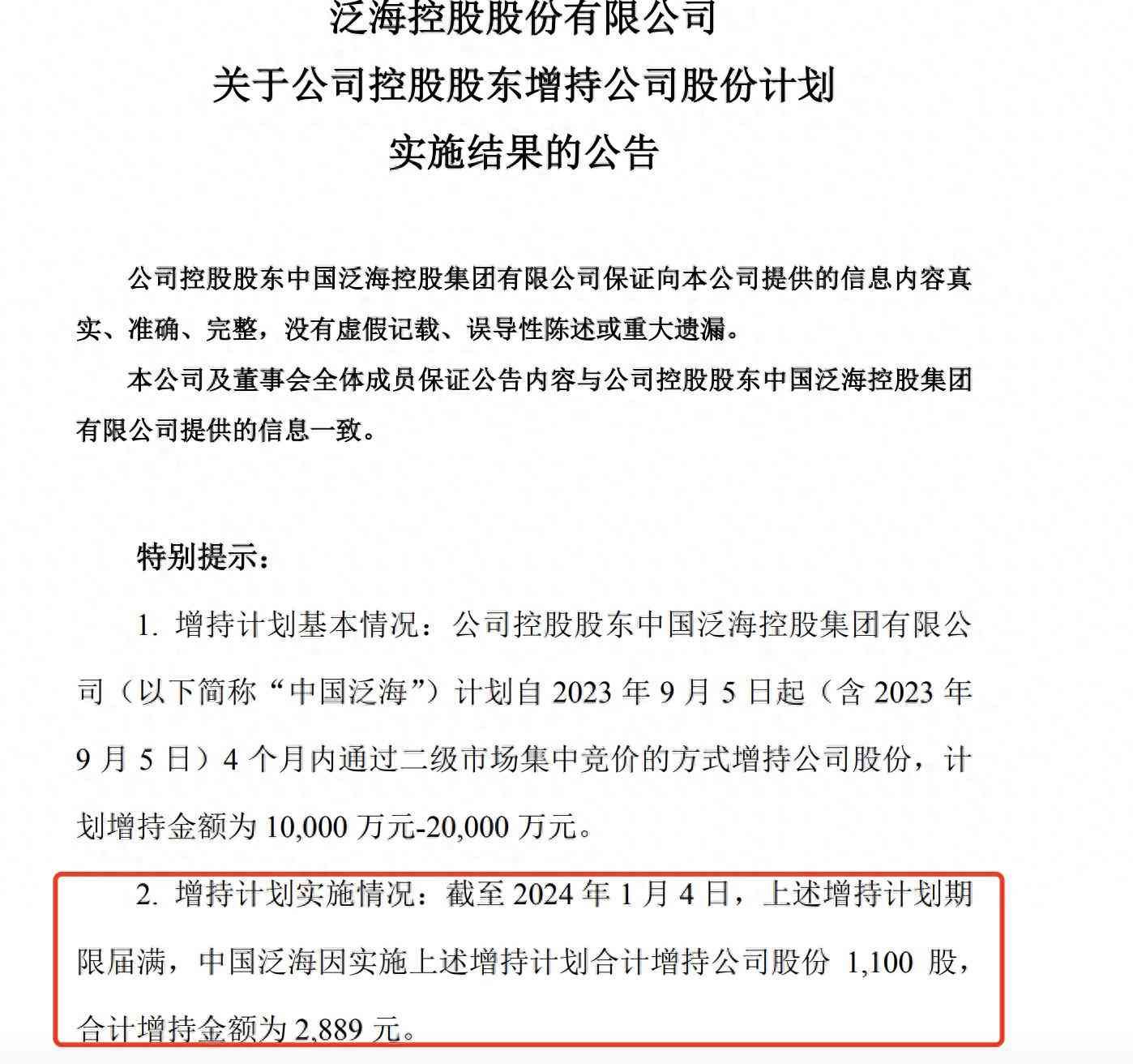 1月4日晚,*ST泛海公告称,公司控股股东中国泛海控股集团有限公司(简称“中国泛海”)计划自2023年9月5日起4个月内通过二级市场集中竞价的方式增持公司股份,计划增持金额为1亿元—2亿元。截至2024年1月4日,上述增持计划期限届满,中国泛海因实施上述增持计划合计增持公司股份1100股,合计增持金额为2889元。