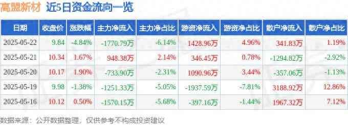 高盟新材(300200)5月22日主力资金净卖出1770.79万元