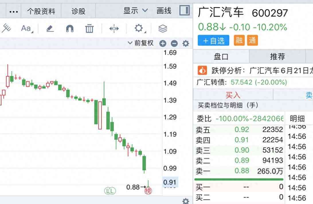 6月21日周五,广汇汽车更是在集合竞价阶段,股价就被摁在了地板上。不过仍有一批多头力量,试图在开盘一瞬间反扑,打市场一个措手不及。但事后看,开盘的多头力量更似昙花一现,后继乏力,这也给市场呈现了一个“倒T字跌停”。截至收盘时,跌停板上排队等待卖出的有265万手。6月21日当天成交额1.25亿元,换手率1.71%。