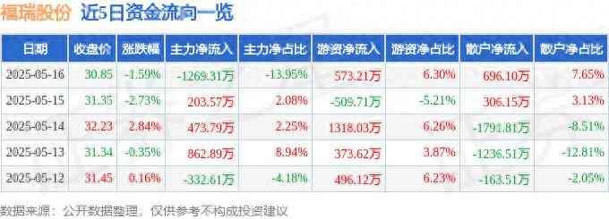 福瑞股份(300049)5月16日主力资金净卖出1269.31万元