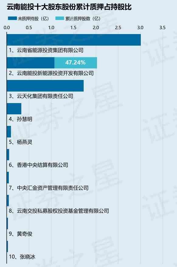 截止本公告日,股东云南能投新能源投资开发有限公司已累计质押股份9572.26万股,占其持股总数的47.24%。本次质押后云南能投十大股东的累计质押股份占持股比例(占持股比例的计算以公司最新一期财务报表公布的十大股东的持股总数为基准)见下图: