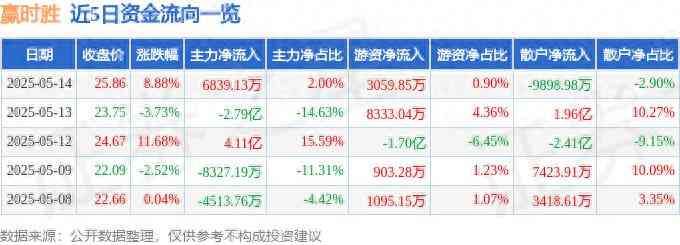 证券之星消息,截至2025年5月14日收盘,赢时胜(300377)报收于25.86元,上涨8.88%,换手率20.5%,成交量137.08万手,成交额34.16亿元。