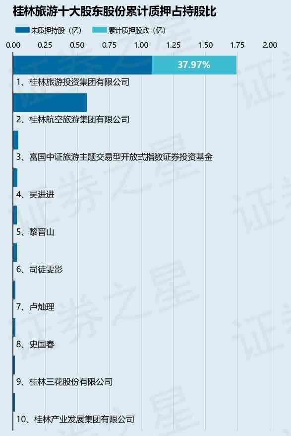 截止本公告日,股东桂林旅游投资集团有限公司已累计质押股份6612.05万股,占其持股总数的37.97%。本次质押后桂林旅游十大股东的累计质押股份占持股比例(占持股比例的计算以公司最新一期财务报表公布的十大股东的持股总数为基准)见下图: