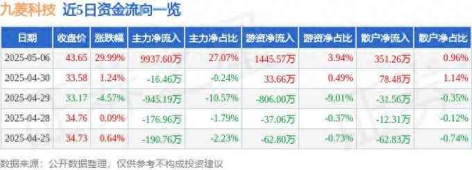5月6日的资金流向数据方面,主力资金净流入9937.6万元,占总成交额27.07%,游资资金净流入1445.57万元,占总成交额3.94%,散户资金净流入351.26万元,占总成交额0.96%。
