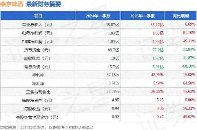 据证券之星公开数据整理,近期燕京啤酒(000729)发布2025年一季报。截至本报告期末,公司营业总收入38.27亿元,同比上升6.69%,归母净利润1.65亿元,同比上升61.1%。按单季度数据看,第一季度营业总收入38.27亿元,同比上升6.69%,第一季度归母净利润1.65亿元,同比上升61.1%。本报告期燕京啤酒盈利能力上升,毛利率同比增幅15.08%,净利率同比增幅64.5%。