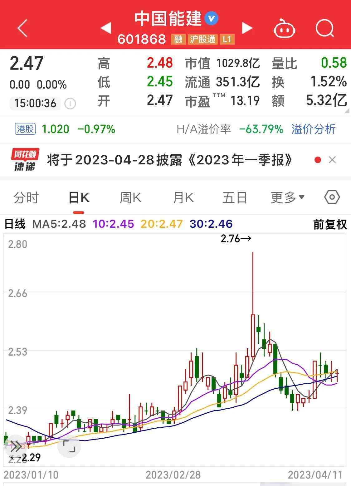 期间走势从未上过2.8元,但它还是有性格,因为跌也不会破2元,最大跌幅2021年11月2.06元。市值正好千亿,流通股143亿,总股本416亿。现在要让它涨4个点那是非常困难。