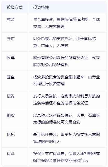 黄金、外汇、股票、基金、债券、期货、信托和保险是八种不同的投资方式,它们在投资特性、风险收益、市场运作等方面存在显著差异。而现货黄金对比其他投资产品又有什么不同之处呢?