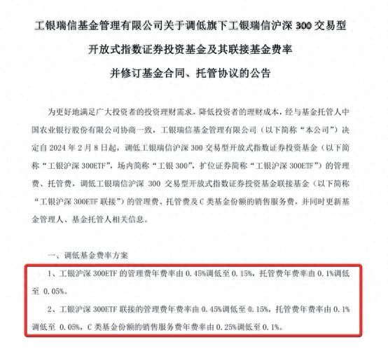 又有ETF降费了,2月8日,工银瑞信基金公告,公司决定自2024年2月8日起,调低工银瑞信沪深3ETF的管理费、托管费,调低工银沪深3ETF联接基金的管理费、托管费及C类基金份额的销售服务费。