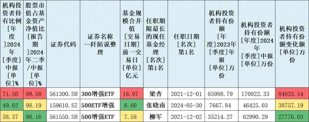 2024年上半年,增强指数型基金机构持有份额新增超1亿元的有三只,分别是3增强ETF(5613)、5ETF增强(159610)、5增强ETF(561550)。