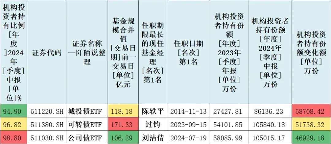 2024年上半年,被动指数型债券基金机构持有份额新增超1亿元的有三只,分别是城投债ETF(511220)、可转债ETF(511380)、公司债ETF(511030)。