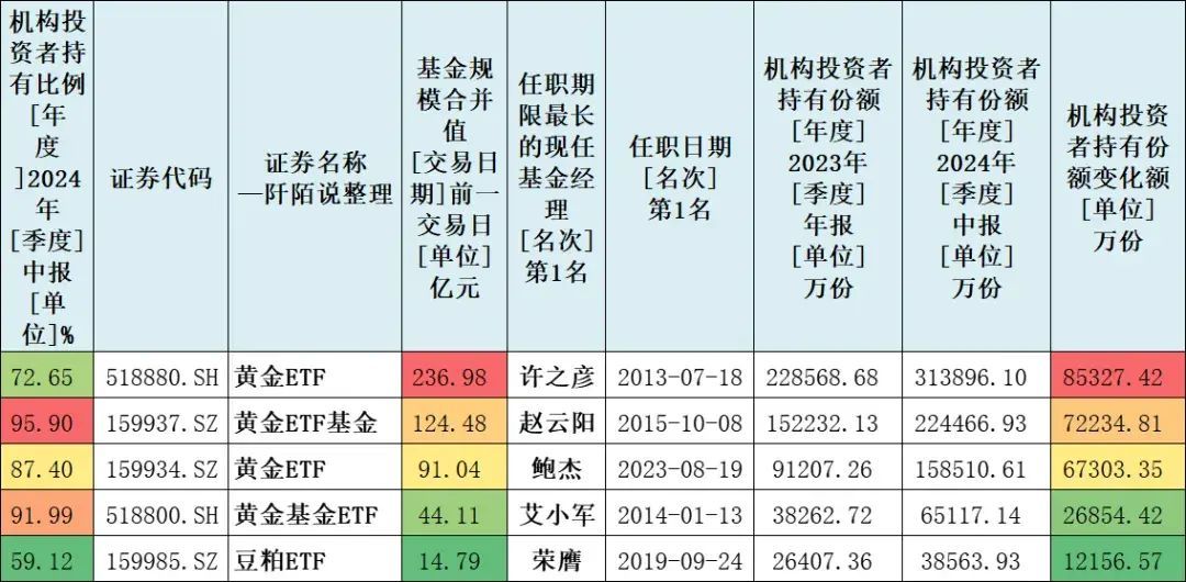 2024年上半年,商品型基金机构持有份额新增超1亿元的有五只,黄金类ETF有四只,另有一只豆粕ETF(159985)。