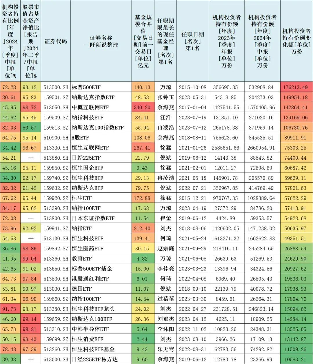 2024年上半年,QDII被动指数型基金机构持有份额新增超1亿元的有28只,详见下表,按照机构持有份额变化额由高到低排序。