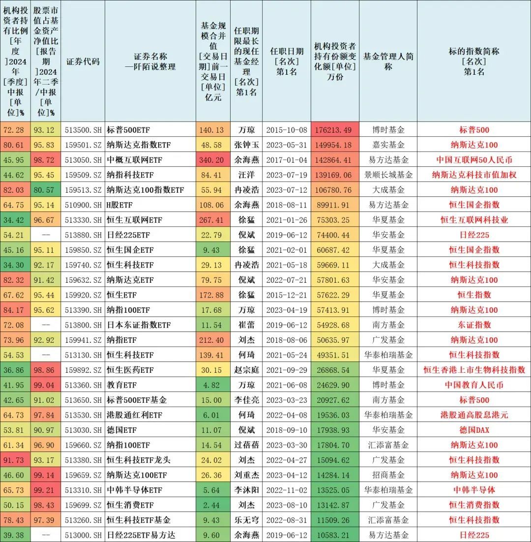 标普5ETF(5135)、纳斯达克指数ETF(159501)、中概互联ETF(513050)、纳指科技ETF(159509)、纳斯达克1指数ETF(159513)等,今年上半年机构持有份额新增超10亿份。