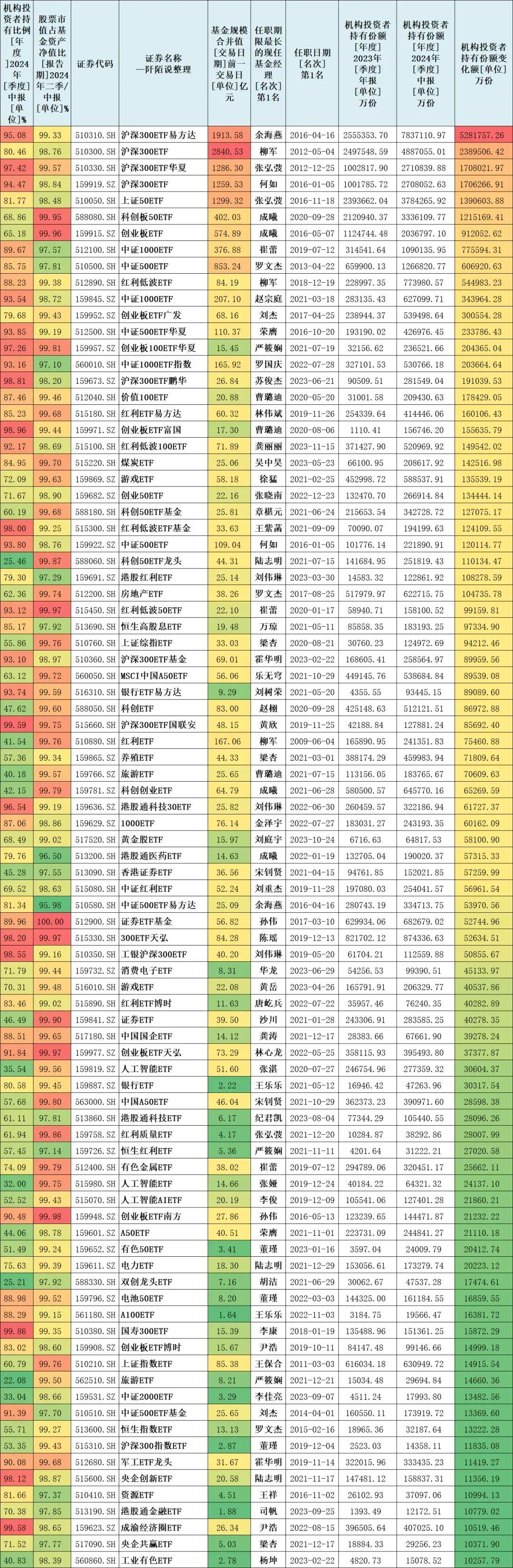 8月已经过去,大家9月好~2024年基金中报应该在8月底披露完毕,所以截至目前应该是披露完毕了。所以,我本文来梳理一下2024年持有份额新增大于1亿份的场内基金(除货币基金)。
