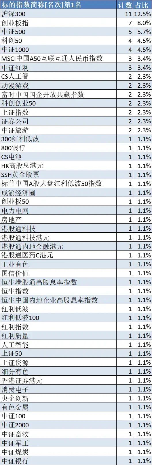 具体来看,88只被动指数型基金,其中有11只是对标沪深3指数,7只对标创业板指,5只对标中证5指数,各有4只对标科创1指数和中证1指数,各有3只对标MSCI中国A50互联互通人民币指数和中证红利指数,各有2只对标CS人工智能指数、动漫游戏指数、富时中国国企开放共赢指数、科创创业50指数、上证指数、证券公司指数、中证旅游指数。