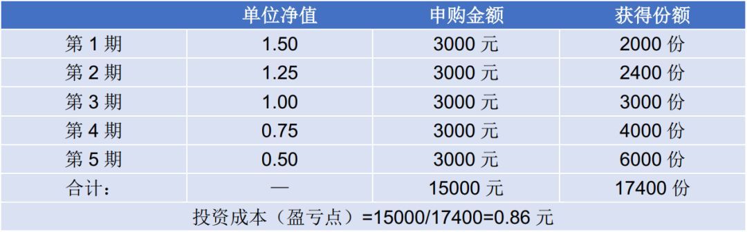 相反,如果我们长期坚持定投,每一期都投,成本就会被逐渐摊薄,你从1.5元开始定投,即使跌到0.5元,也只需要再涨0.36元,即成本达到0.86元时就可以解套。