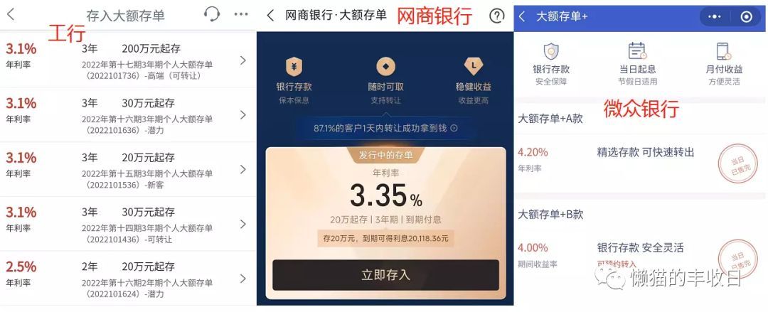 而且,存款也不只有定存一种,形式还是蛮多的:1)大额存单这种一般是20万起存,金额大了,收益也会再高一些。工行3年期大额存单年利率是3.1%,某民营银行3年期大额存单年利率是3.35%,还有一家民营银行利率更高一些,年化利率是4%和4.2%(这两款产品没啥区别,4.2%的要靠抢(很难抢到),4%的可以预约存)。