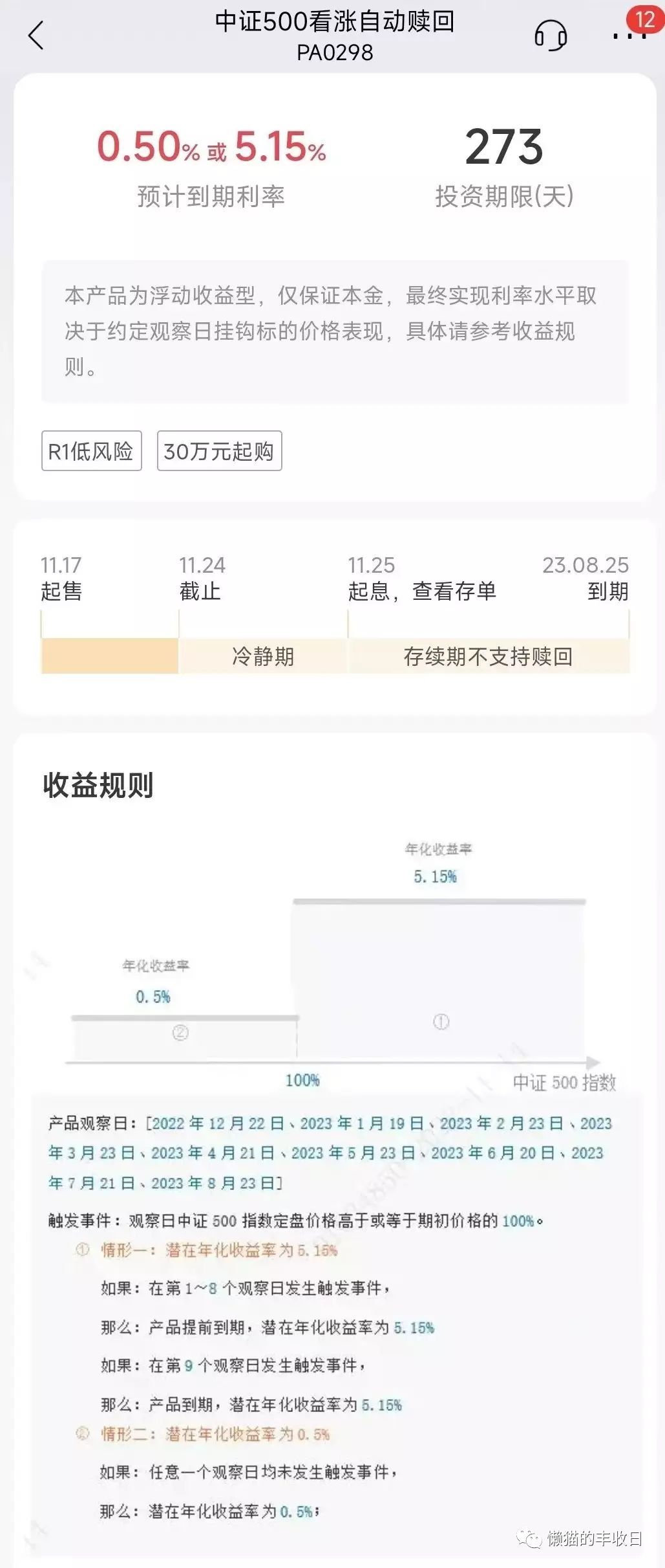 2)银行结构性存款银行的结构性存款一般会挂钩某类资产。以某行的“中证5看涨自动赎回”为例,它挂钩中证5指数,约定了9个观察日。只要在这9个观察日中的任一天,中证5的收盘价高于期初价格,投资者就能获得5.15%的年化收益,反之则只能拿到0.5%的收益,有点像和银行对赌。