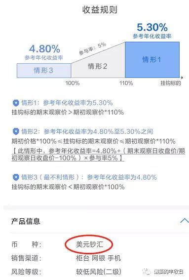 某家银行还有挂钩“XX全球资产轮动指数”的结构性存款。这个存款要存2年,2年后如果指数涨幅超过10%,银行给你按年化5.3%计算收益。最差的情况,如果指数跌了,银行按年化4.8%给你计算收益。也就是说这个产品的年化收益介于4.8%-5.3%之间。当然也有风险,这是个美元产品,存进去的是美元,取出来的也是美元,2年后如果美元汇率跌了,你也会承担一部分汇兑损失。