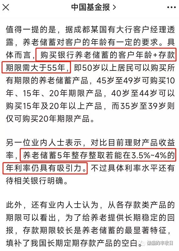 3)特定养老储蓄还有刚刚试点的特定养老储蓄产品,据说5年期年利率能到3.5%-4%,比普通存款高不少。存款期限也要长得多,分为5年、10年、15年、20年四档。目前只在合肥、广州、成都、西安和青岛五个城市开展试点,不过存入有限制,要求“客户年龄+存款期限 > 55年”,年轻人可能不符合条件,但真想买的话也有途径,以父母的名义买呗!