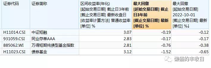 02低回撤的产品多低算低呢?我们以债券基金的平均表现为标准。过去3年,债券基金的平均年化收益是3.12%,最大回撤是1.52%,这一波最大回撤是0.65%。回撤比它低,且有对应基金的主要是这3个指数:短债基金指数、同业存单指数、中证短融。