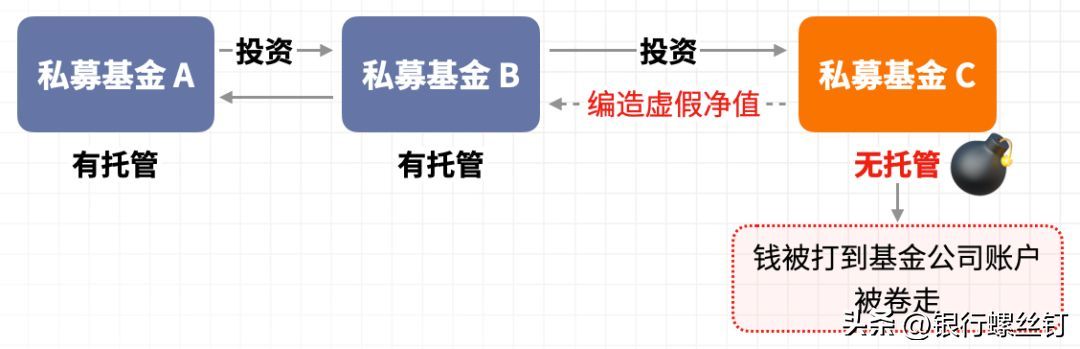 私募基金A——投资私募基金B——投资到一个没有托管机制的私募基金C的产品上。