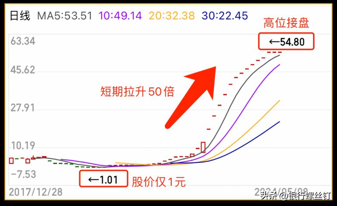 之后在短期内,把股价拉升了50多倍,最高时炒到54.8元。