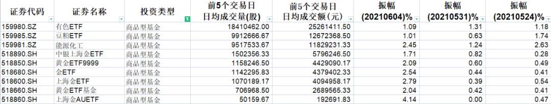 看他们的日均成交量,前面三只基金(有色ETF、豆粕ETF、能源化工)流动性不错。怎么判读它们的流动性,最简单的办法就是看它们买一到买五、卖一到卖五,是否基本连续,连续则说明流动性不差。