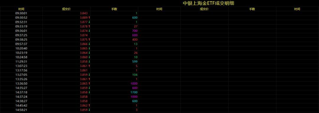 下面是成交量排名第四的中银上海金ETF(518890)的成交明细,可以看到交易很不活跃: