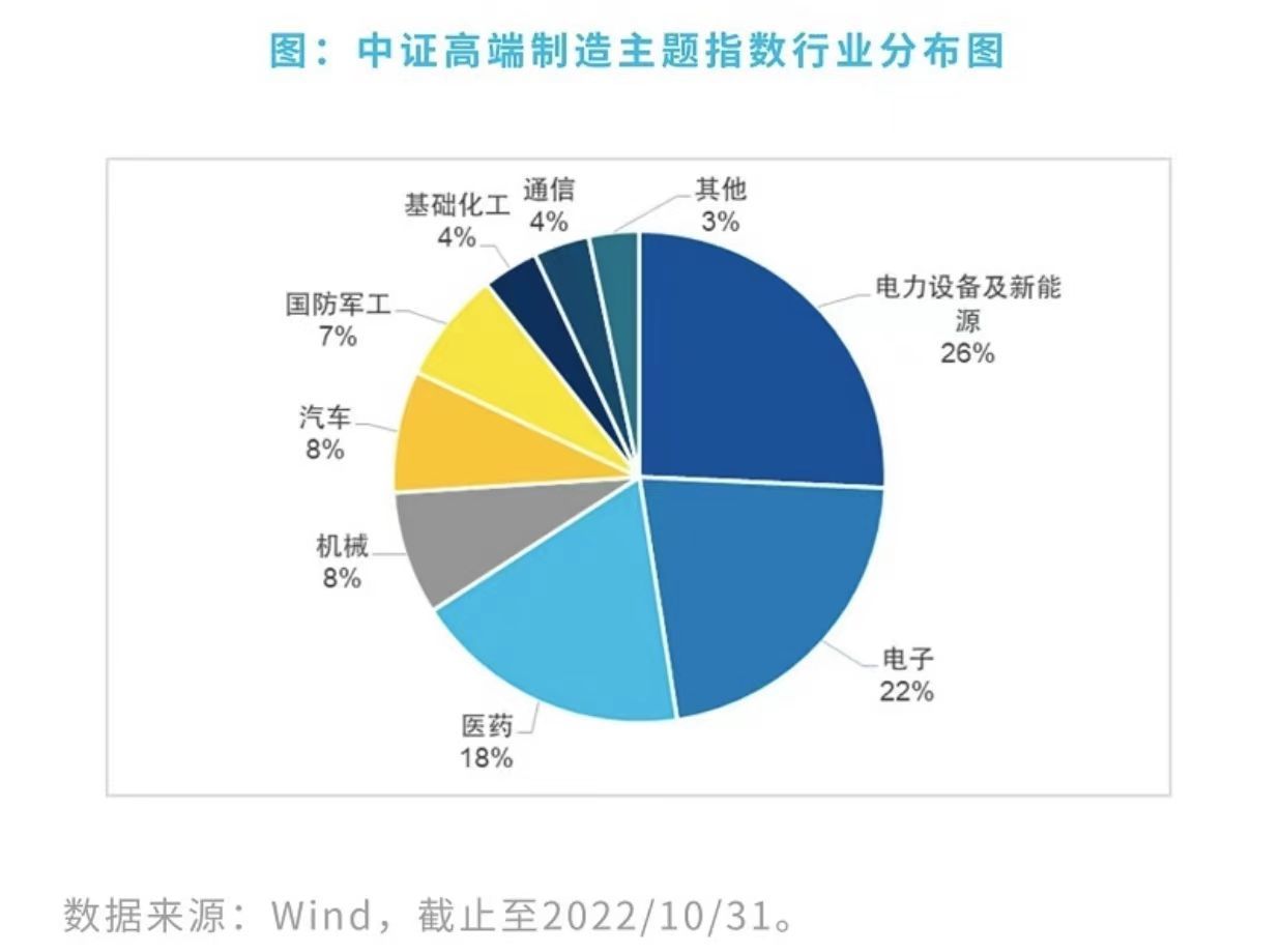 例如2:中证高端制造主题指数(930820.CSI)中的5只成份股渉了及航天航空与国防、通信设备、半导体产品、 生物科技、西药、电子设备与仪器、汽车、电脑与外围设备等众多领域内的上市公司证券,其中电力设备及新能源(26%)、电子(22%)、医药(18%)等行业占比最高。虽涉及的行业不少,但始终围绕“高端制造”这一主题。