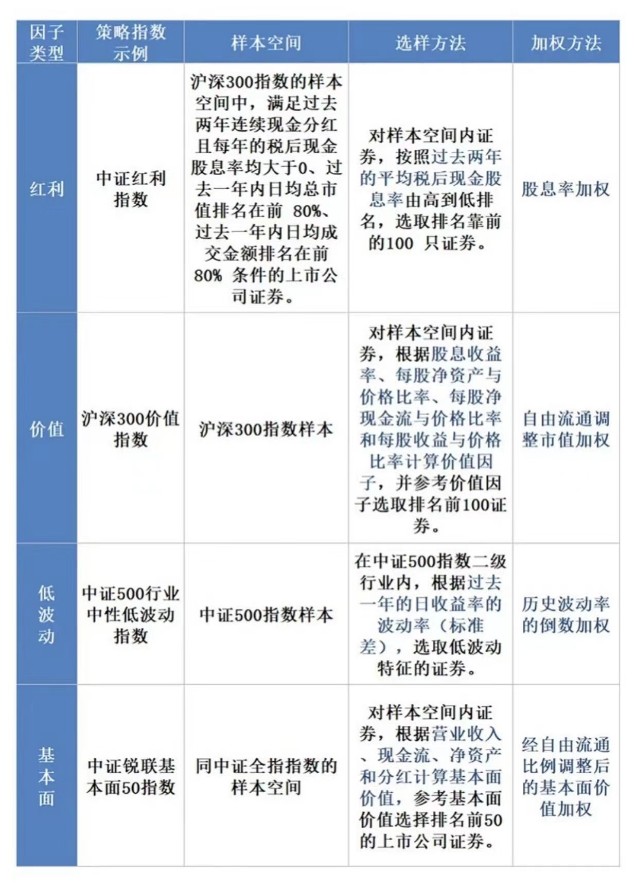策略指数,也经常被人们称为聪明贝塔(smartbeta)策略指数。与传统指数相比,策略指数的主要特点是通过调整指数编制方法中在“选样、加权、构建组合”的过程中突出特定风格因子的因素,选出符合要求的成份股,力求指数获得跑赢传统指数的超额回报。常见的因子有价值、成长、红利、低波动、基本面等词汇。策略指数作为指数化投资标的,不仅能保留指数化投资运作透明、费率低的特点,还可能想主动投资一样获得超额收益,或者有望提高收益-风险比。能够将主动投资和被动投资的特点自然结合,优势互补,增加了投资者的一项选择。下图是常见的几种策略指数的选样空间、选样方法及加权方式