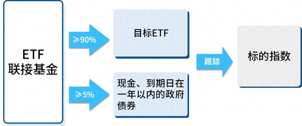 第一,跟踪方式上,ETF联接基金是将不低于90%的基金资产投资于同一管理人管理的、跟踪同一标的指数的ETF,以间接实现对标的指数的跟踪: