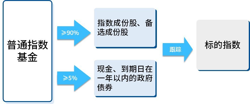 普通指数基金是将基金资产的绝大部分投资于标的指数的成份股及备选成份股,基金合同会约定投资于上述资产的比例不低于基金净资产的90%: