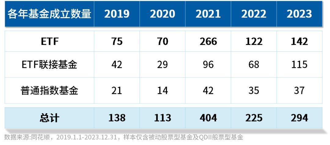 第二,数量上,随着指数基金日趋ETF化,ETF联接基金的数量增长也较为明显,截至2023年末,在现有场外指数基金中,ETF联接基金的数量占59%,而近五年成立的场外指数基金中ETF联接基金的数量占比为70%。近五年ETF、ETF联接基金及普通指数基金成立数量情况: