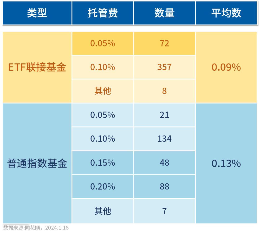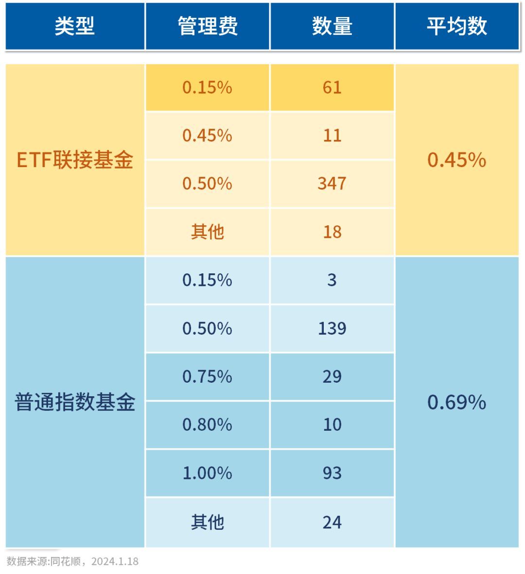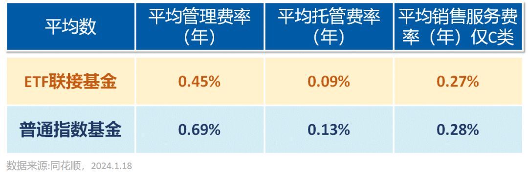 第三,整体而言ETF联接基金的平均(简单平均)管理费率及托管费率低于普通指数基金,而销售服务费差异不大。