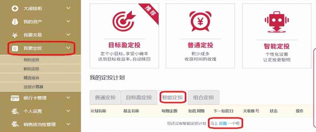 以大成基金为例,登录大成基金官网,在账户中点击【我要定投】——【智能定投】——【设置】就可以了。