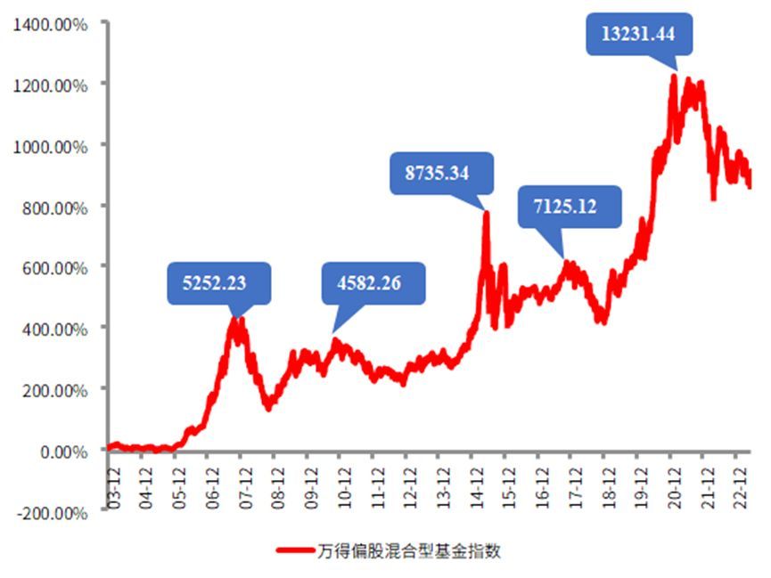 从24年至今,万得偏股混合型基金指数分别经历了下图中28年1月、2010年11月、2015年6月、2017年11月和2021年2月这五个阶段性历史高点: