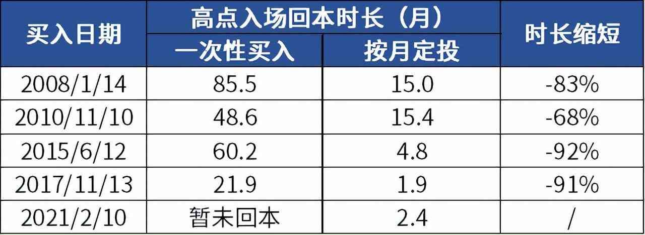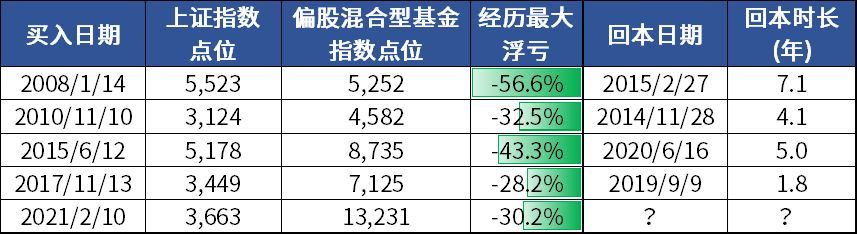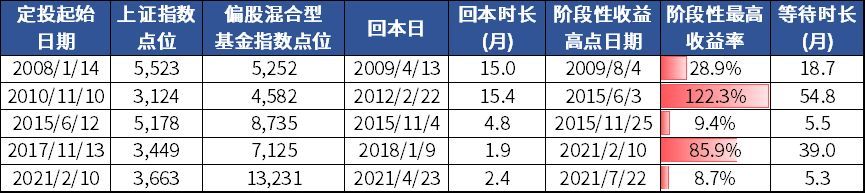 在各轮熊市的高点买入偏股混合型基金指数,通过坚持定投,不仅能回本,还能将回本时间明显缩短。换言之,如果你运气没那么差,买入的时点不是阶段最高点,那么情况可能会更好。