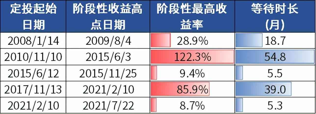 观察上文中定投回测数据不难发现,从阶段性收益高点的情况来看,等待时长与取得的区间最高收益率呈现正相关性,这也恰恰契合了定投延迟满足的特点。