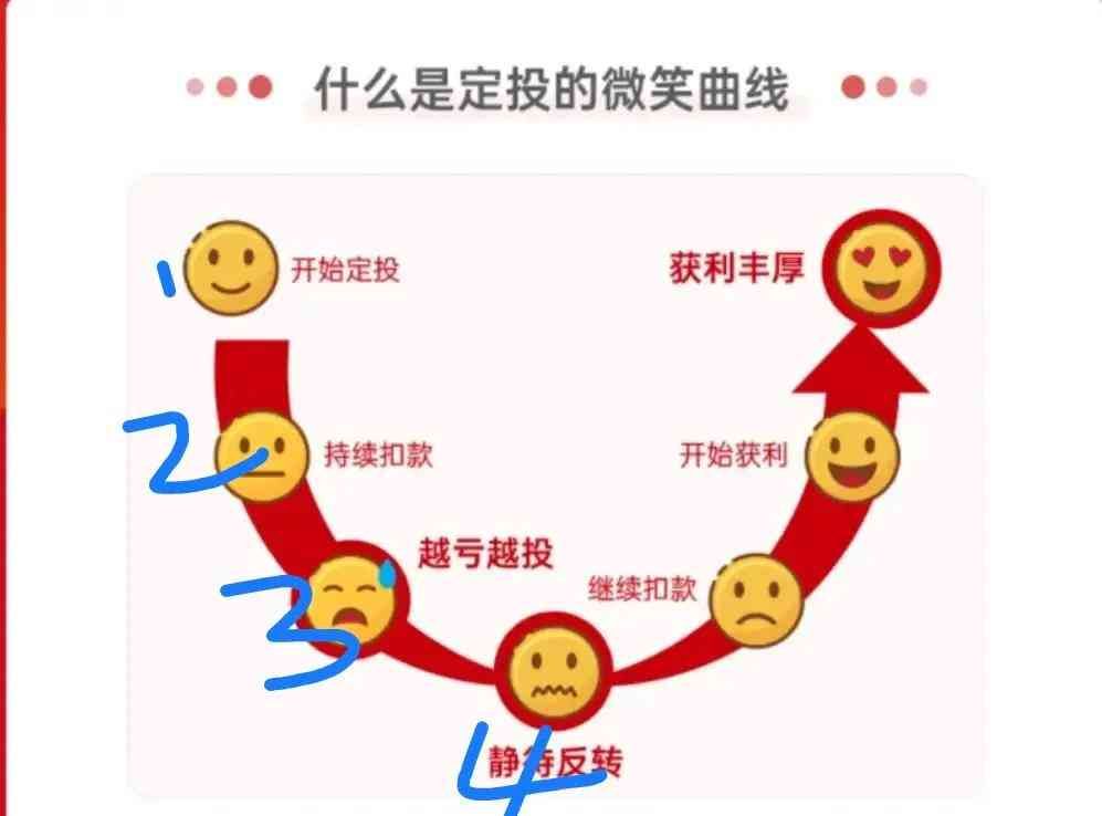 2、大部分的定投都是从位置1或者位置2开始,也就是从微笑曲线的左半边开始,一直坚持定投到位置4,并到达微笑曲线的右边,才有可能赚钱。大部分人坚持到3或者4就放弃了,所以一直亏损。