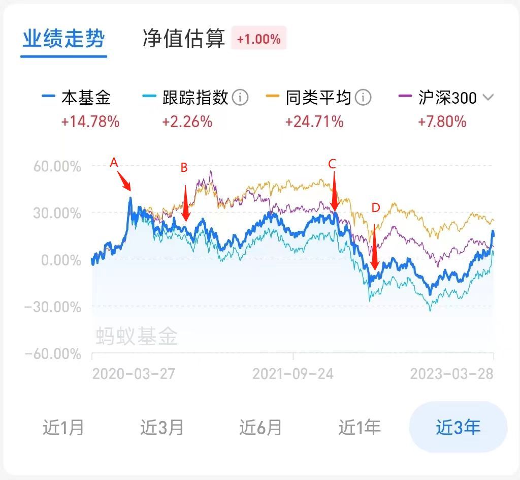 以下图人工智能指数基金三年走势为例,选择在A、B、C、D四个点位开始定投,对盈利周期、盈利幅度的影响是非常大的。