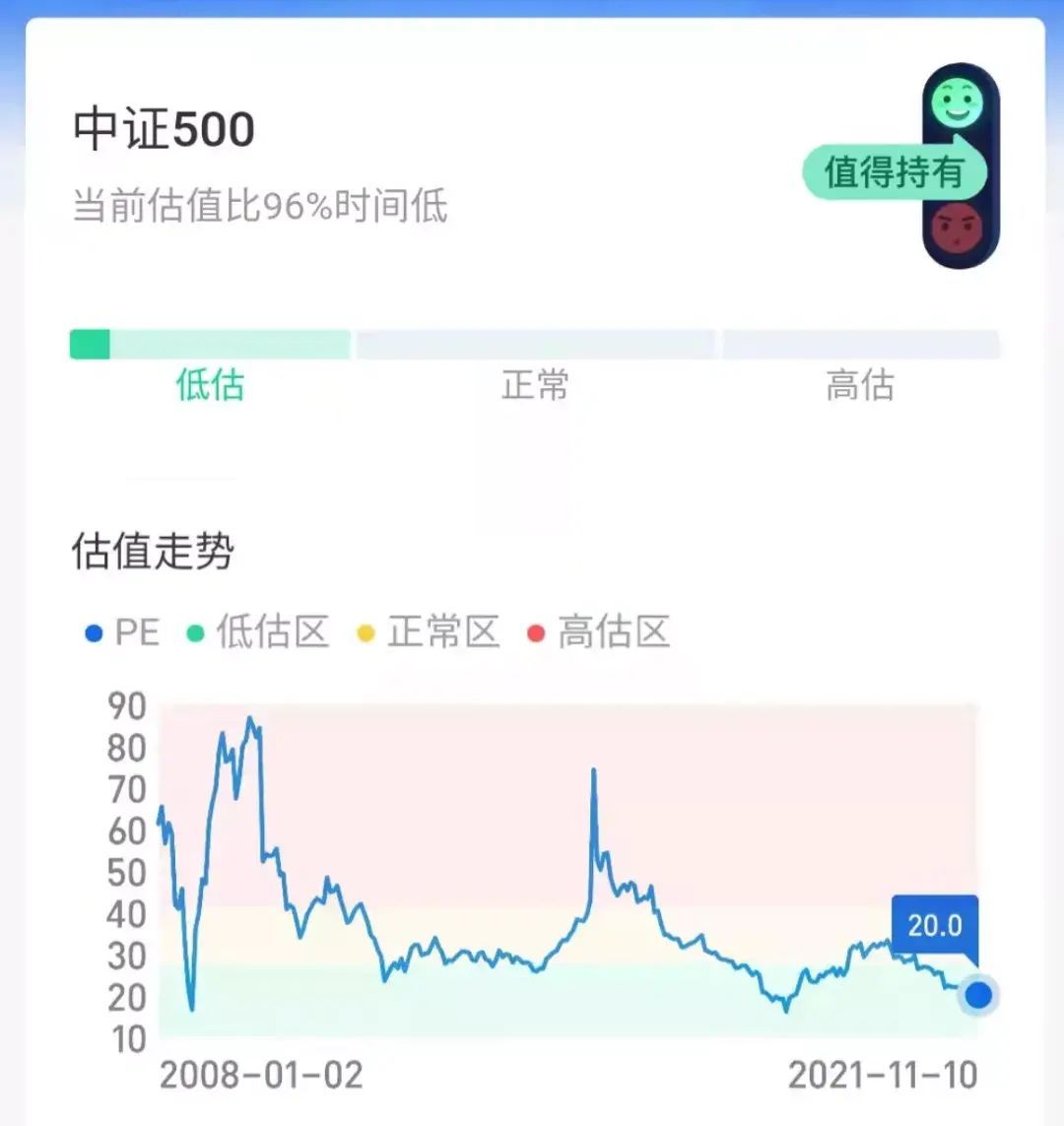 上图就是截取的支付宝指数红绿灯对中证5指数的判断,通过低估区、正常区、高估区判断当前价格风险,当然,这个也不能说百分百准确,但是相对来说专业性比我们自己判断好很多,因此还是推荐使用。