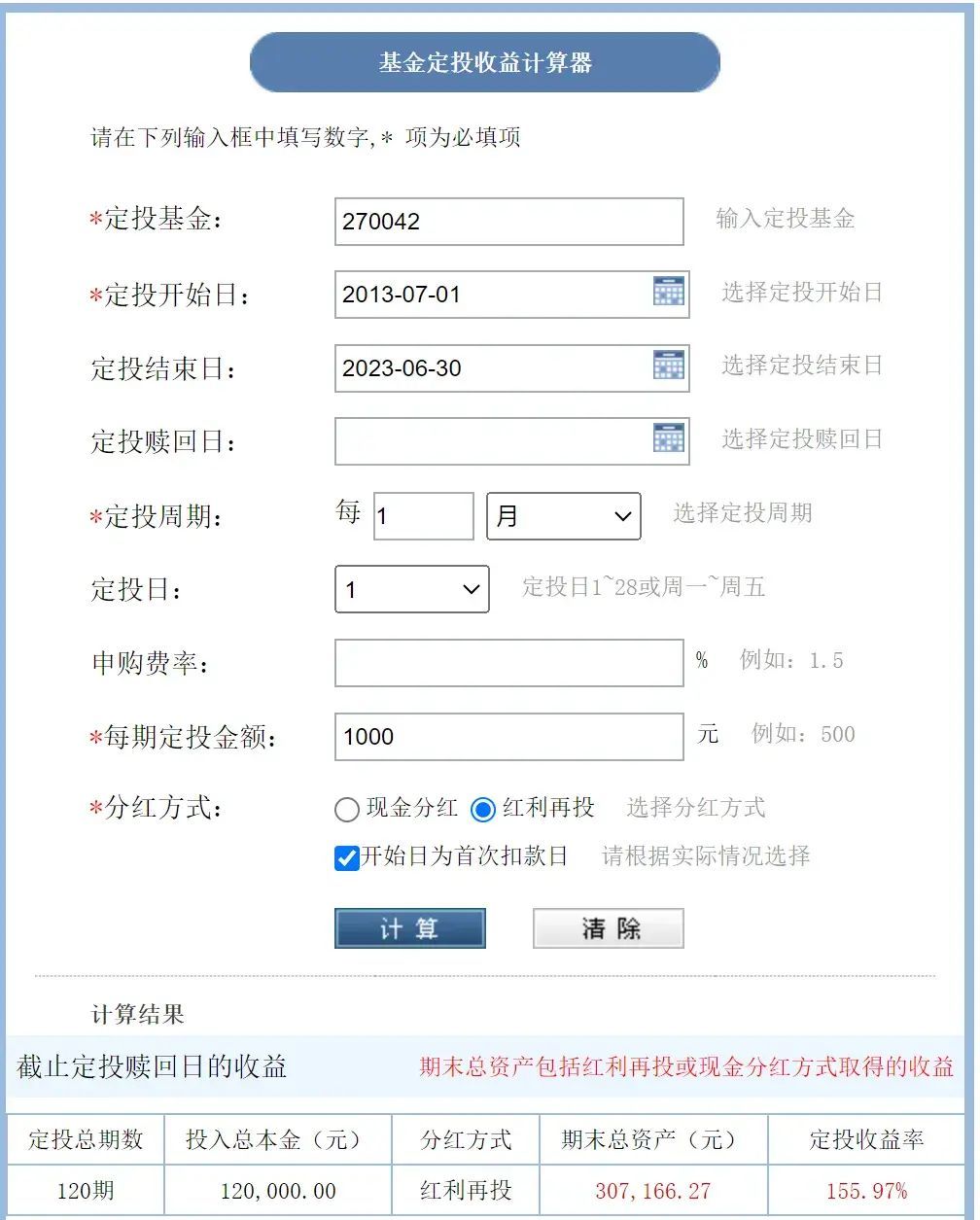 2013年7月1日~2023年6月30日,正好10年。假设每月1日投1,申购费率目前是0.13%,暂且就忽略不计了。定投总期数正好120期,总成本12万,期末总资产30.7万左右,10年定投收益率155.97%,年化大概4.5%,已经不算差了。