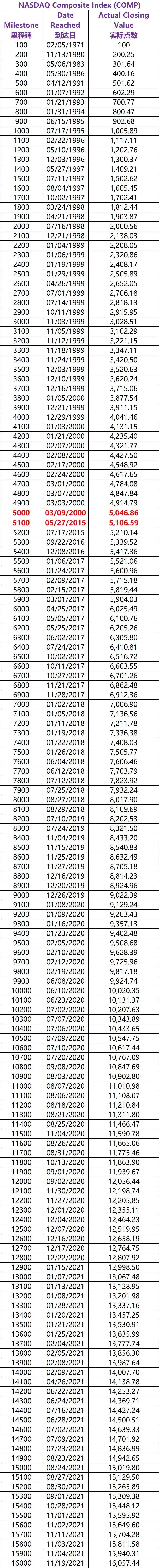 这是在纳斯达克官网下载的纳指里程碑(milestone)表,记录了从1971年起每涨1点的时间节点,最高冲到16点,1971-2021,1点到16点,50年,160倍,理想化的年化利率121%,太理想化了,想都不敢想。